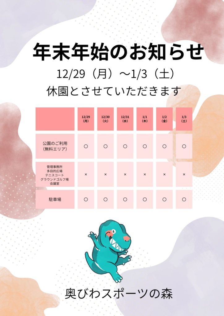 奥びわスポーツの森は12月29日~1月3日を休園させて頂きます。